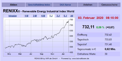 Der regenerative Aktienindex RENIXX World ist in der letzten Handelswoche mit 731,44 Punkten aus dem Handel gegangen (Schlusskurs 31.01.2020). Gegenüber der Vorwoche (Schlusskurs: 732,13 Punkte) ist das ein minimaler Verlust von 0,1 Prozent. Der Großteil der Aktien notiert bei Handelsschluss im Minus. Eine starke Performance zeigt nach Veröffentlichung von Geschäftszahlen der US-Elektrofahrzeughersteller Tesla.