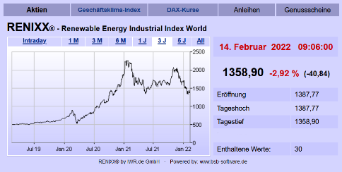 Börse KW 06/22: RENIXX mit Tendenz zur Mini-Erholung - Enphase: Rekordergebnis 2021, Scatec: Dividende, Ørsted: grüne Flugkraftstoffe, Encavis: Mehr Wind- und Solarleistung