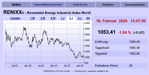 Das regenerative Börsenbarometer RENIXX World hat in der letzten Woche um 2,7 Prozent auf 1.064,48 Punkte zugelegt (Schlusskurs, 16.02.2024). Gefragt sind die Titel von First Solar, Nordex und Solaredge. Am Indexende landet Bloom Energy. Die gerät Vorlage der Q4-und Jahresbilanz unter Druck und verliert zweistellig.