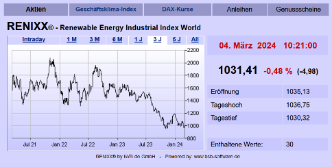 Der regenerative Aktienindex RENIXX World hat in der letzten Woche gedreht und um 6,2 Prozent auf 1.036,39 Punkte zugelegt (Schlusskurs 01.03.2024, Börse Stuttgart). Auf Jahressicht steht der RENIXX damit derzeit bei einem Minus 13,2 Prozent (Vorwoche: -17,5 Prozent). Besonders gefragt sind in der letzten Woche die Aktien Plug Power, SMA Solar und Nordex.