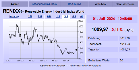 Das regenerative Börsenbarometer RENIXX World hat in der letzten Woche den Abwärtstrend fortgesetzt und mit einem Minus von 5,3 Prozent auf 1.011,07 Punkten geschlossen (Schlusskurs 28.06.2024, Börse Stuttgart). Kaum relevante Unternehmens-Meldungen und politische Unsicherheiten belasten derzeit die Entwicklung. Überkapazitäten im Solarsektor drücken auf die Preise und Margen, die Zinswende kann nur erahnt werden und anstehende Wahlen werfen ihre Schatten voraus.