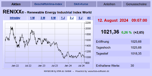 Das regenerative Börsenbarometer RENIXX World hat in der letzten Woche um 1,4 Prozent auf 1.018,71 Punkte nachgegeben (Schlusskurs 09.08.2024). Nach einem zwischenzeitlichen Jahrestief von 958,28 Punkten am 05.08.2024 auf Intraday-Basis beendete der RENIXX den Handel an dem Tag noch mit 998,50 Punkten nur knapp unter die 1.000 Punkte-Marke. Schon am Folgetag notierte der RENIXX wieder über der charttechnisch wichtigen Marke, die er bis Börsenschluss am Freitag halten konnte.