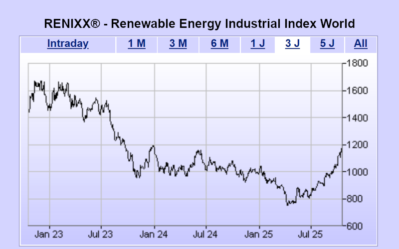 Der globale Aktienindex für erneuerbare Energien RENIXX World (ISIN: DE000RENX014) hat in der letzten Woche um 3 Prozent auf einen Schlusskurs von 1.141,52 Punkten zugelegt (Schlusskurs 17.10.2025). Das liegt knapp unter dem Jahreshoch, das der RENIXX mit 1.180,39 Punkten auf Schlusskursbasis am Donnerstag (16.10.2025) markiert hat. Besonders kräftig entwickelten sich mit zum Teil zweistelligen Kursgewinnen in der letzten Woche (Schlusskurse: 17.10.2025): Bloom Energy (+29,5%), Green Plains (+23%), Canadian Solar (+16,3%), Ballard Power (+10,3 %) und Solaredge (+6,1%). Auf der Verliererseite standen Goldwind (-8,5 %), Sunrun (-8,1 %), Xinyi Solar (-7,7 %), Grenergy Renovables (-3,4 %) und Vestas (-3,0 %).