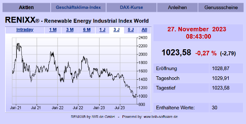 Das regenerative Börsenbarometer RENIXX World hat in der vergangenen Woche um 1 Prozent auf einen Kurs von 1.026,37 Punkte nachgegeben, bleibt damit aber weiter über 1.000 Punkten. Auf Jahressicht steht der RENIXX damit bei einem Minus von 30,4 Prozent. Das bisherige Jahreshoch (Schlusskurs-Basis) wurde am 02.02.2023 mit 1.666 Punkten erreicht, das Jahrestief (Schlusskurs-Basis) mit 955 Punkten am 10.11.2023 markiert.