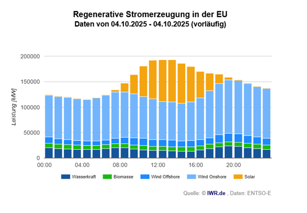 Am 4. Oktober 2025 erreichte der Bedarf an Kraftwerksleistung in der EU-Spitze rund 275.000 MW. Davon stellten regenerative Kraftwerke wie Wind-, Solar- und Wasserkraftanlagen bis zu 200.000 MW Leistung bereit. Allein die Windenergie steuerte am Abend bis zu 120.000 MW (onshore und offshore) bei, während die Solaranlagen mittags Strom mit über 80.000 MW erzeugten.