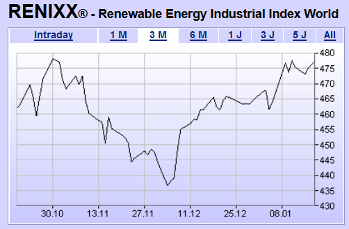 Münster – Der RENIXX hat sich in der letzten Handelswoche behauptet. Der deutsche Leitindex DAX gibt sich trotz der Turbulenzen im Syrien-Konflikt fester. Angeführt wird der RENIXX von Solartiteln.